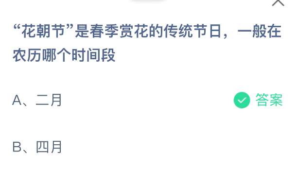 1、题目:“花朝节”是春季赏花的传统节日,一般在农历哪个时间段