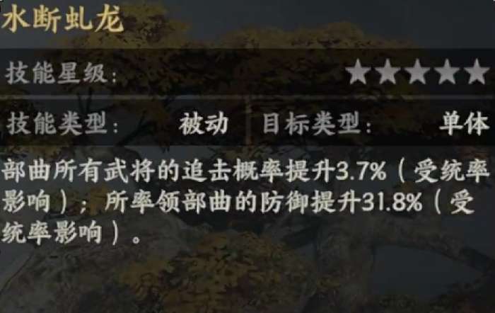 还有一个极为独特的兵书技能叫做水断虬龙,追击敌人时可以优先使用这一技能,部曲全体武将在追击时的概率大大增加,同时还可与赵云,马超进行强力的阵容联合,形成一个最强的追击流阵容,消灭敌人时让他们无处可逃。而追击流组合时的阵容,原理就在于通过普通攻击增加伤害,再辅之以追击概率的提升,让整个队伍的移动速度和伤害的面积达到巅峰数值。