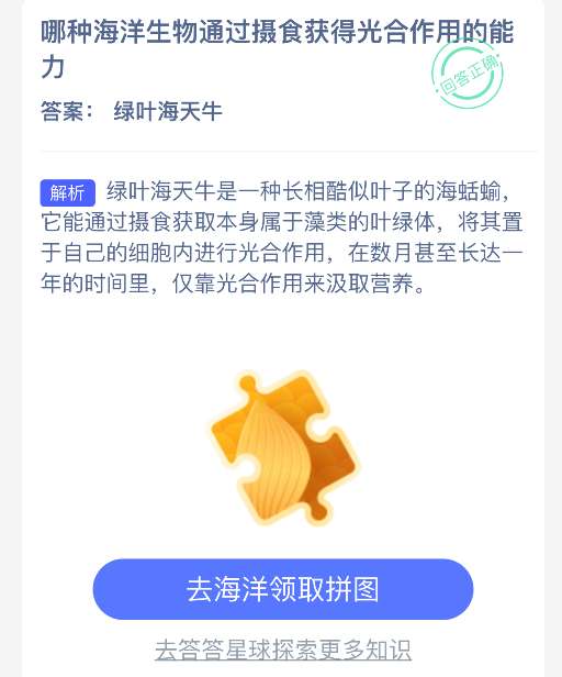 哪种海洋生物通过摄食获得光合作用的能力?【神奇海洋】2026年1月11日新题目已开答!正确答案现已公布,点击领取拼图,一起为修复海洋生态贡献力量!今日正确答案是:【绿叶海天牛】。绿叶海天牛通过摄食获得光合作用的能力。