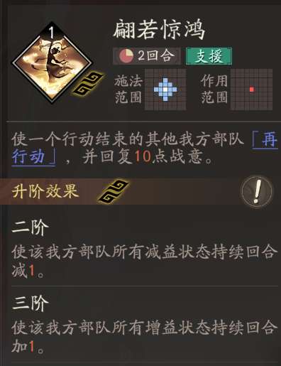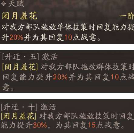 在升阶搭配时,就需要注重与技能的搭配,如果没有天赋要求,那就可以选择翩若惊鸿+舞影+扶危,其中翩若惊鸿是核心的在动技能,是必须要带的。扶危无冷可以奶血,而且还能够达到驱散的效果,可以轻松的缓解生存压力。天赋在达到两阶以上想要起到碾压的效果,那就可以选择翩若惊鸿+沉鱼落雁+援兵,沉鱼落雁就可以群体回血,而且还可以回复战意。配合天赋就能够给全队叠buff。还有一个援兵就能够弥补冷却空白打起来真的是又快又爽。
