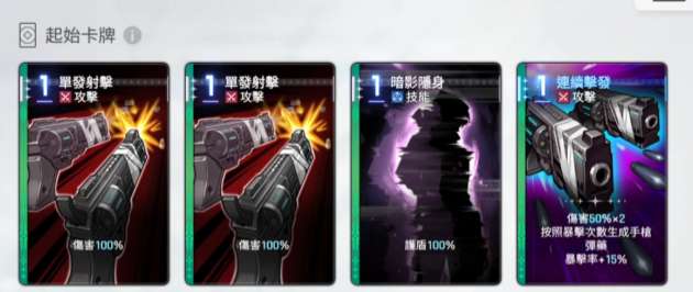 路克的强大之处在于他自身的卡牌系统是有很多卡牌区分能力的,他在自身的初始卡组当中组合就比较独特,这里他上场自身带的卡牌有包括两张造成100%伤害的普通攻击卡,以及一张消耗1点能量的技能暗影隐身,这个卡带的技能可以为路克附加足够的护盾,利用这样的一张专属卡路克也可以带来多次的连续打击效果,而在这里进行每次攻击的时候都可以造成50数值的%伤害,并能在暴击时生成手枪弹药,同时提高15%暴击率生成效果,所以路克在后期自身有足够的卡组加成的情况下也是会有更多爆发潜力的。