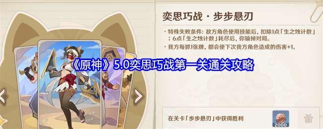 原神5.0奕思巧战第一关是步步悬刃,需要在敌方使用6次技能前获胜,一波4只怪,适合打AOE。也可利用场地BUFF,用娜维亚之类能抓牌的角色单体点杀。