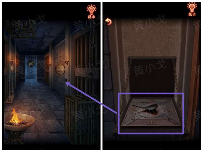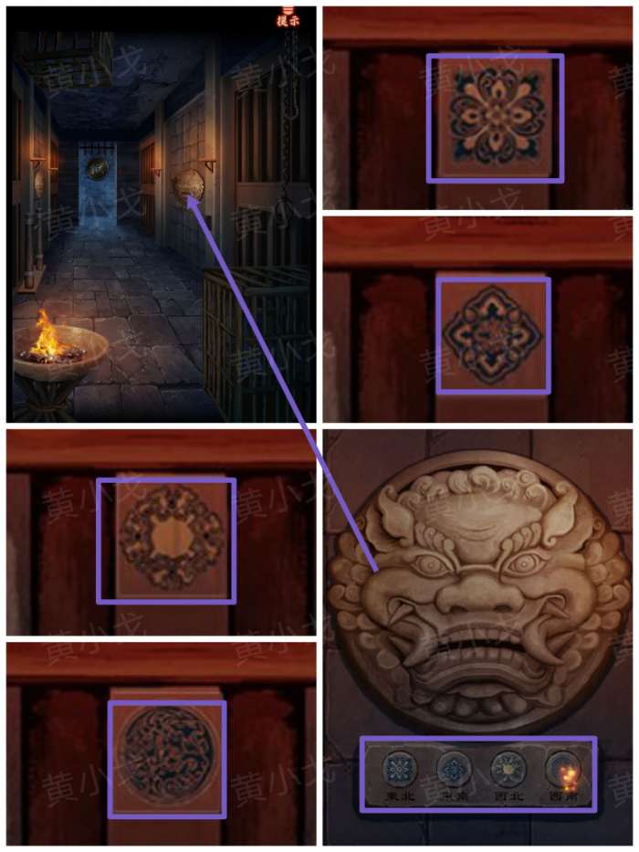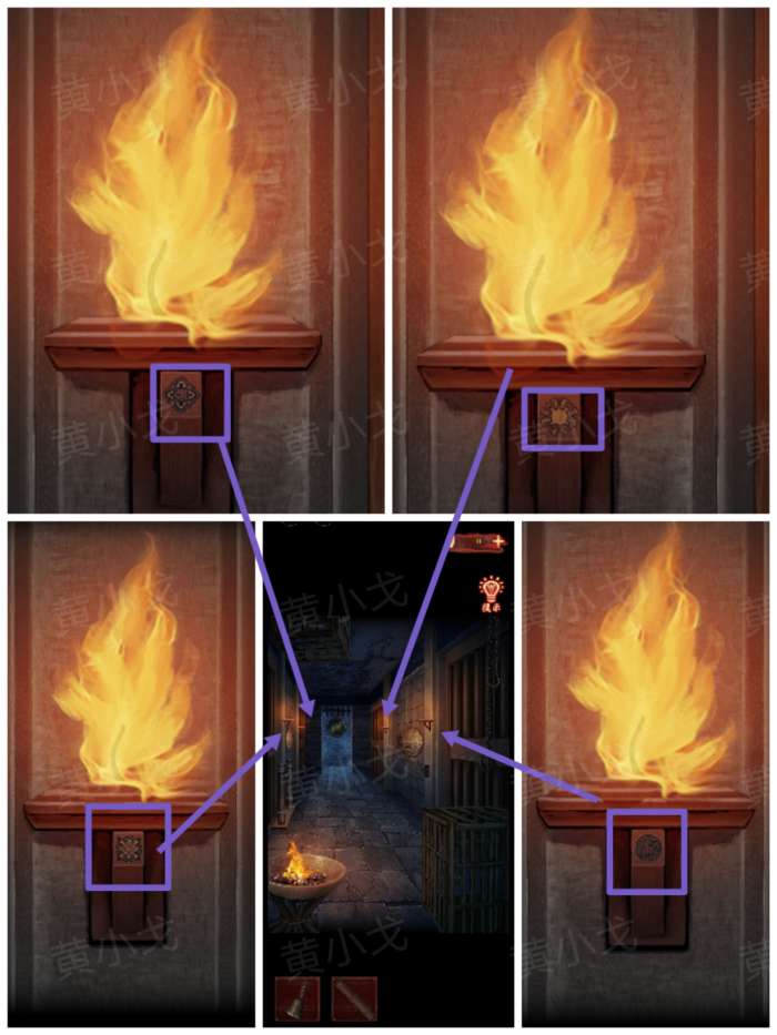 17.点击右侧墙上的兽首,根据上面的提示,结合火把的位置和上面的图案,调整对应的图案