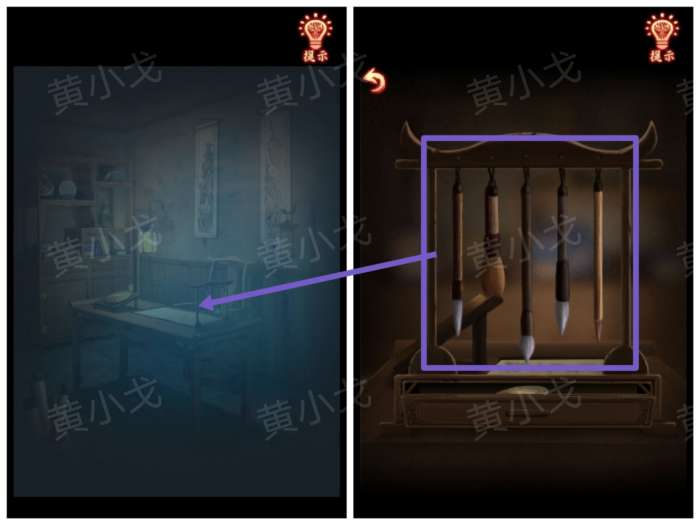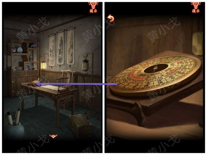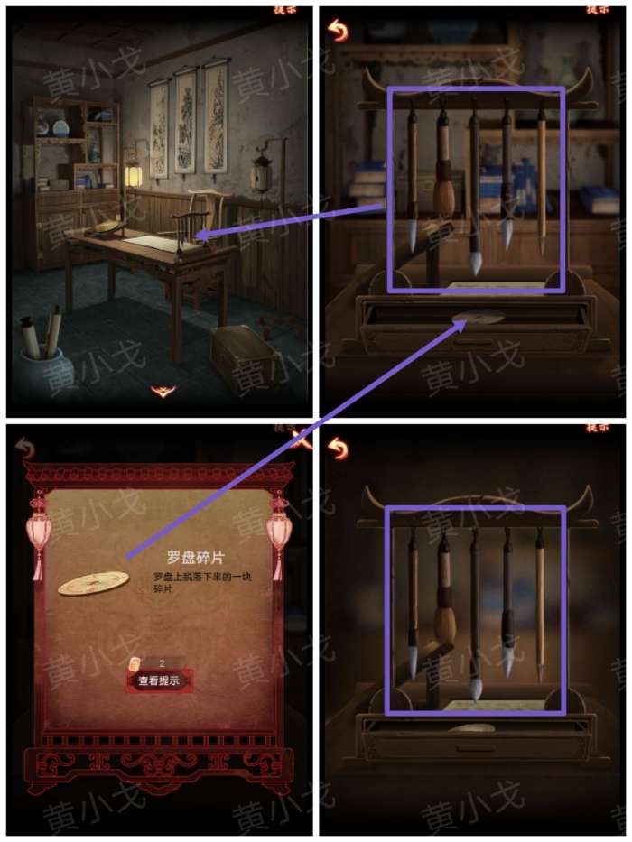 15.点击罗盘,回到现在。点击桌子上的毛笔架,根据过去的毛笔架的线索,调整毛笔的位置,获得【罗盘碎片】
