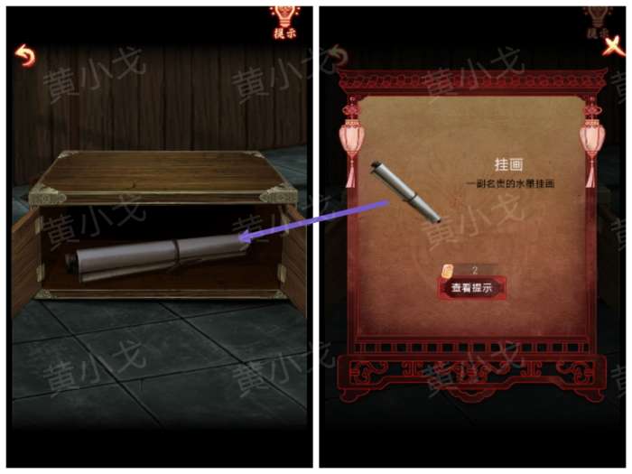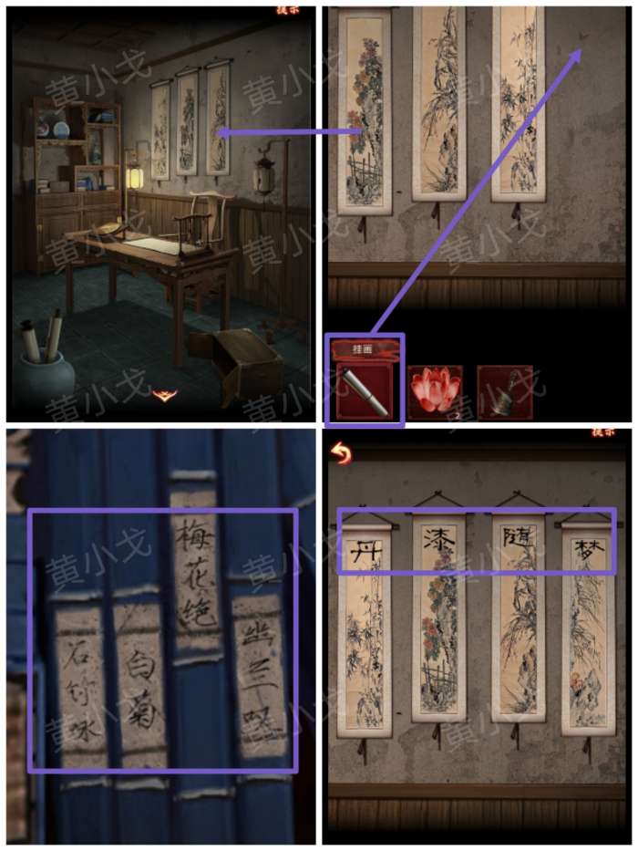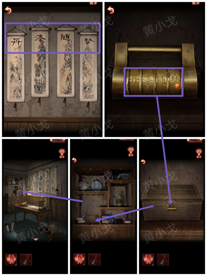 22.点击架子上的盒子,根据挂画上的线索,输入密码:丹漆随梦