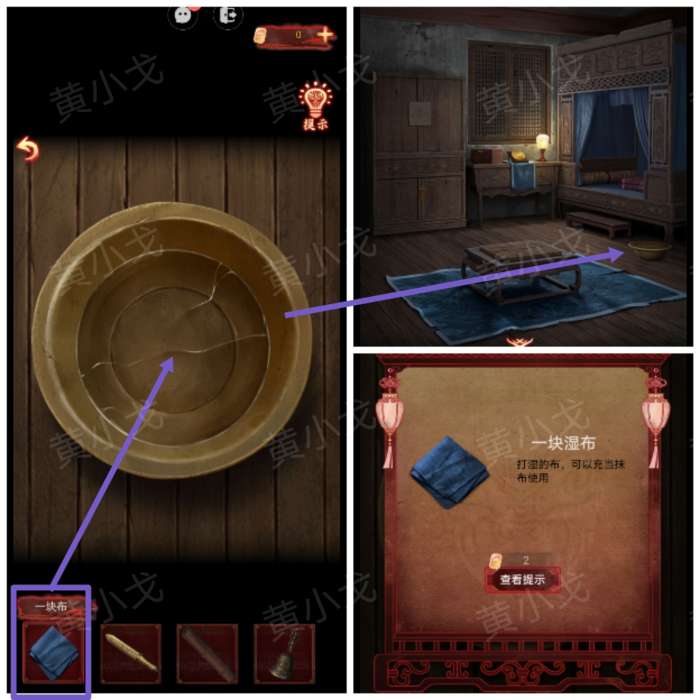 23.点击水盆,把【一块布】湿水,获得【一块湿布】