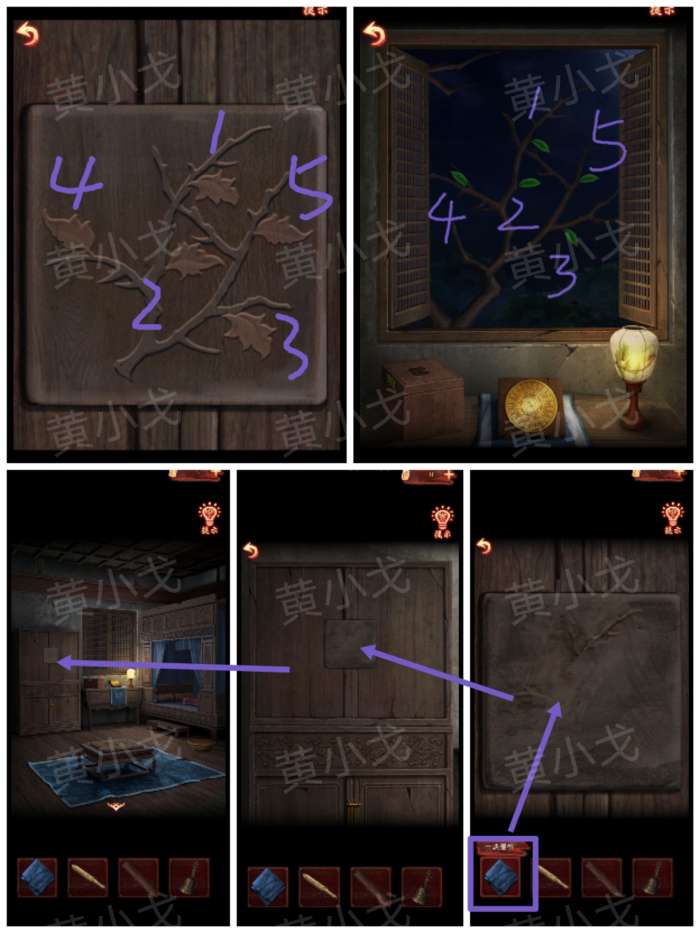 1.点击罗盘,回到现在。点击柜子上的木块,用【一块湿布】擦掉上面的污渍,根据过去绿芽长出的顺序,按顺序点击叶子