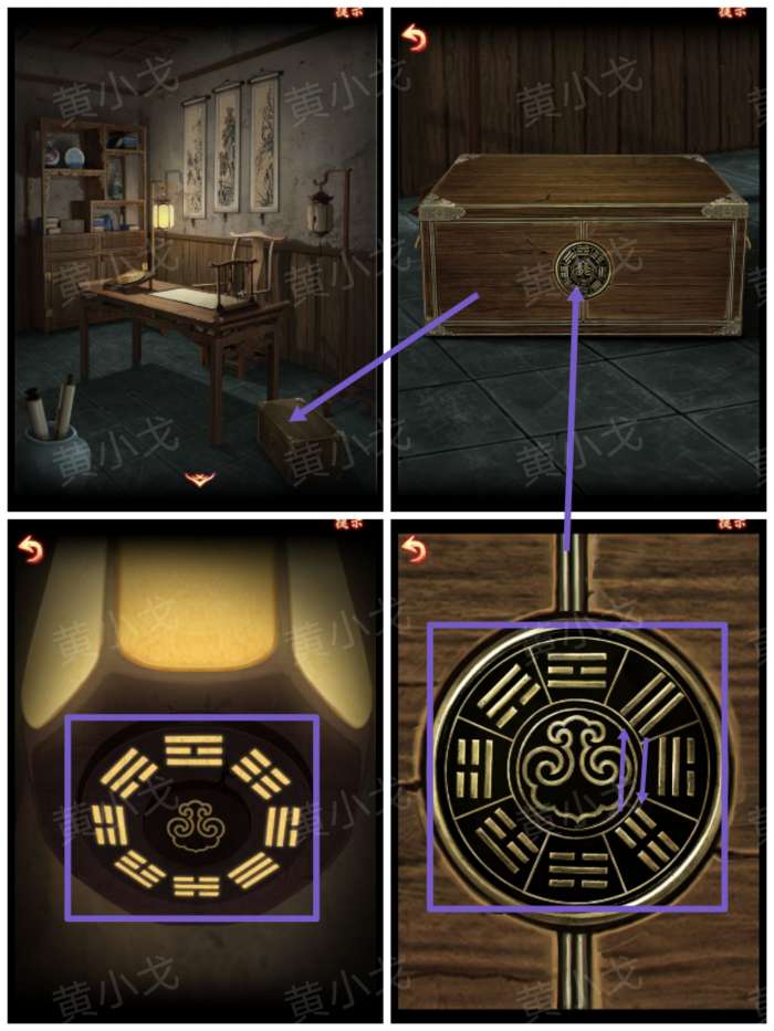 19.点击罗盘,回到现在。点击地上的箱子,根据过去的灯上的线索,调整密码锁上的图案