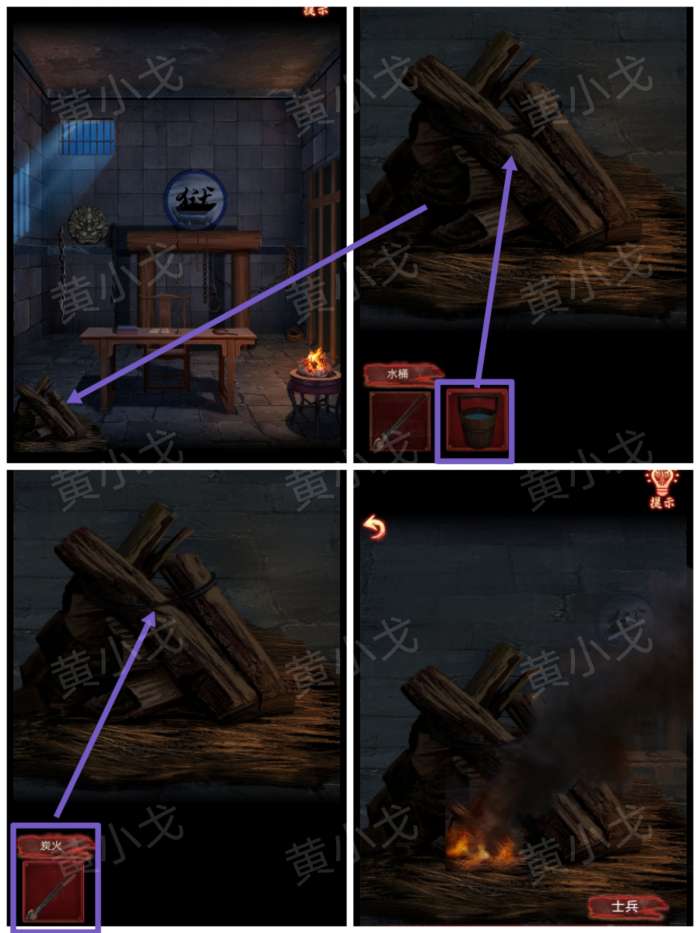 7.点击柴火堆,倒上【一桶水】,用【炭火】点燃