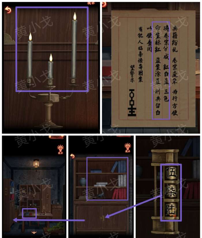 11.点击存放卷宗的柜子,点击柜子上的密码锁,根据上面的卷宗颜色及数量,结合信件上的线索和烛台的线索,输入密码:伍柒陆