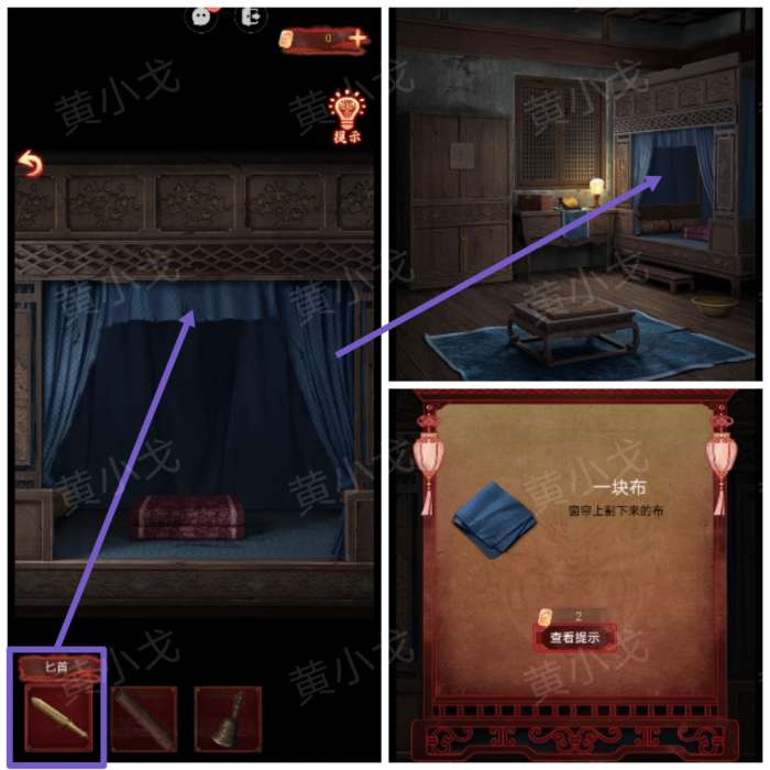 22.点击床,用【匕首】割下一片床帘,获得【一块布】