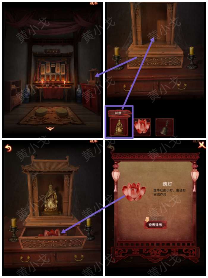 12.点击右侧柜子上的神龛,放入【神像】;打开抽屉,获得【魂灯】