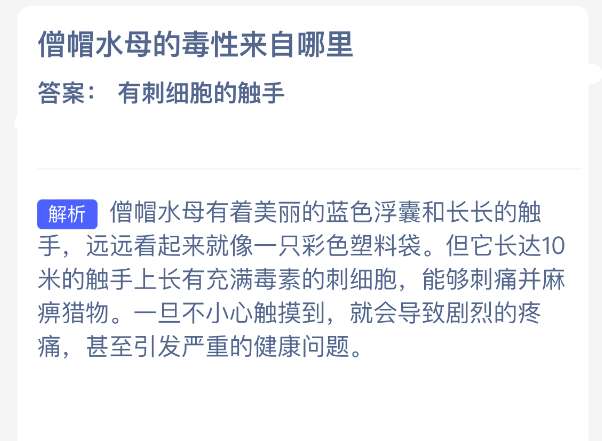 以上就是僧帽水母的毒性来自哪里?神奇海洋今天答案最新2025年12月3日分享,更多相关攻略内容,请点击关注pk游戏网更新!