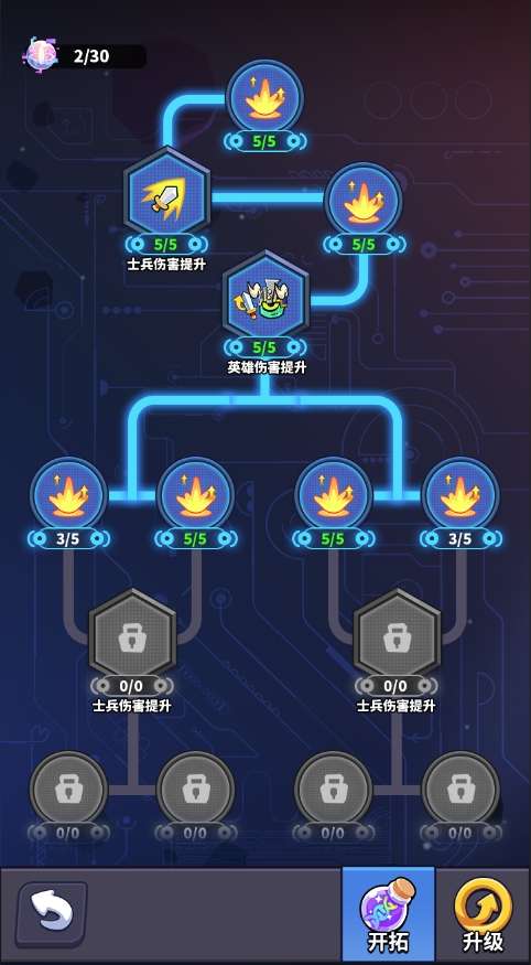 当解锁当前节点后,下个节点到当前节点的线路会亮起。满足升级条件时,点击升级按钮即可升级。