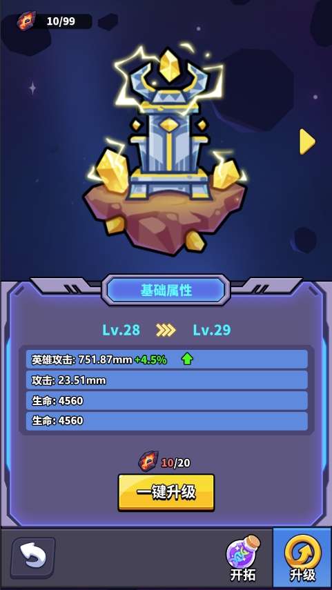主页面会呈现多个星球,每个星球都有两条养成线,分别是升级和开拓。