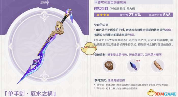 活动白嫖满精单手剑!固定需要护盾!有普攻和重击的伤害提升,和暴击提升!萌新要的伤害和保命都有了!可以在活动期间有强化武器buff时拉满。