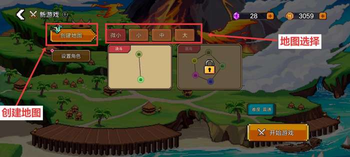 位于游戏主菜单时点击新游戏即可进行对局创建。点击新游戏—创建地图即可选择游戏地图。地图分为微小、小、中、大共四种大小,地图越大,完整游玩所需时长也会相对增加。(初次游玩推荐选择微小地图中的决斗地图进行体验)。