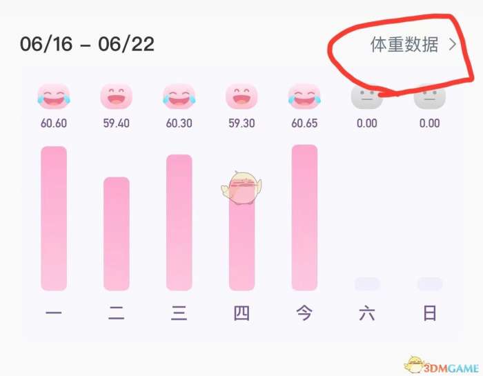 2、进入软件首页看到一个显示体重变化的柱状图。在它的最右边有个体重数据字体,点击进入。