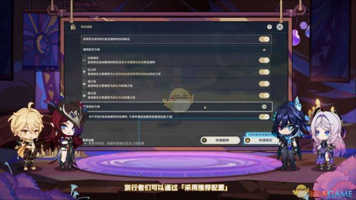 圣遗物锁定新增星星标记及一键配置套装推荐方案等功能,同时圣遗物也将支持按近期获得的时间排序。