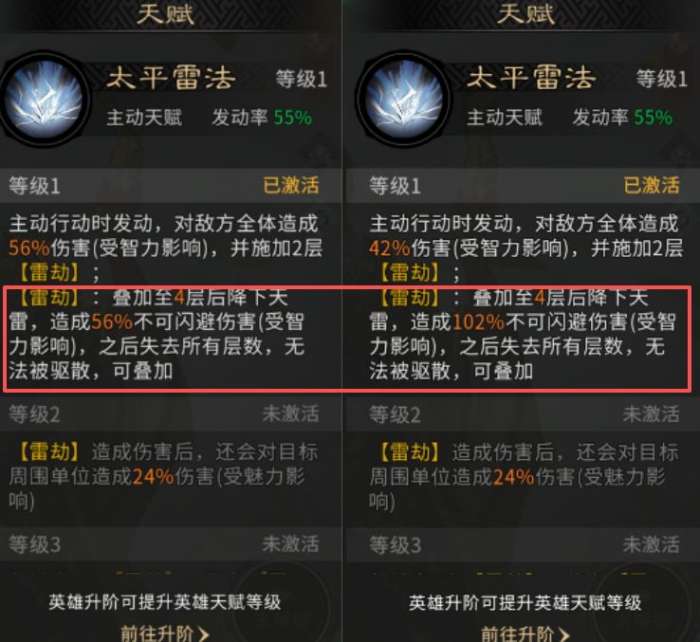 三国天下归心张角技能效果一览,张角的调整侧重于天赋机制的重塑。其1阶段天赋的主动伤害虽有下调,但核心的【雷劫】伤害获得巨幅提升。这一改动使张角的爆发更为稳定致命,整体输出能力不降反升,有望在新版本中占据独特的一席之地。