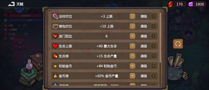 天赋方面,我推荐优先升级基础的法杖栏位、背包栏位、进门回血和生命有关的内容,毕竟活着才有DPS!更大的背包也可以让我们尽可能多的积攒各种法术,更迟进入重铸房。等到古神之血足够解锁更多天赋时,再升级【法术】【遗物】的出现概率助力追梦!