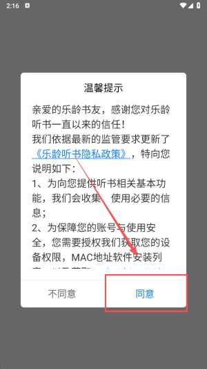 1、点击界面上的“同意”按钮,顺利进入应用,开始您的阅读之旅。