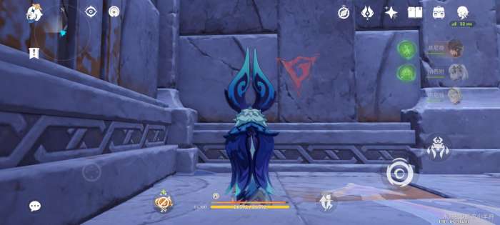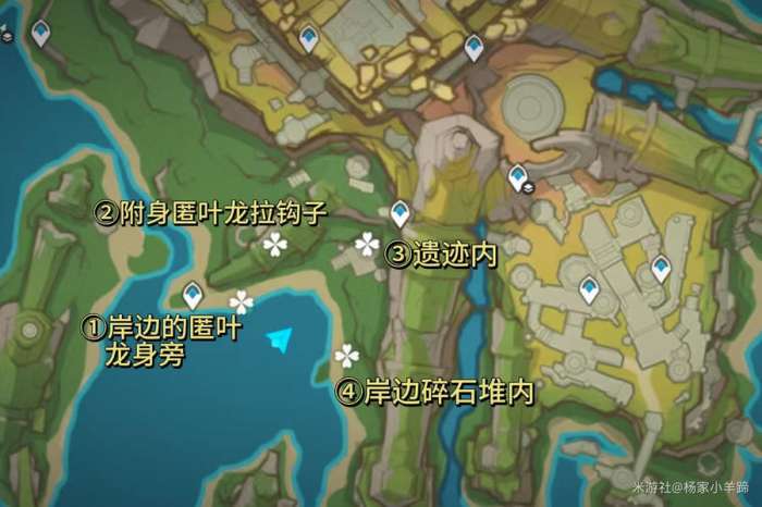 2. 4块石板:来到图中位置,将4处石板都唤起即可转动水中圆环机关,获得珍贵宝箱*1