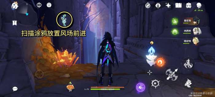4. 涂鸦宝箱:来到图中位置,附身瞑视龙,扫描墙壁上的涂鸦宝箱,把它放置在箭头指向的圆形坑中,即可解锁精致宝箱*1