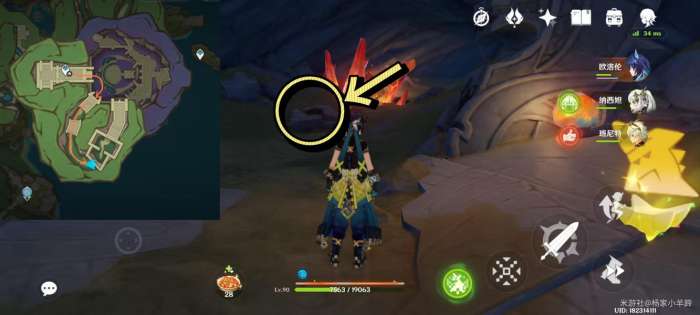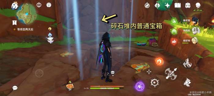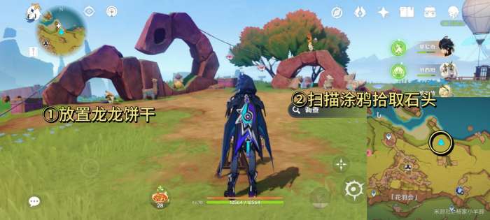 把刚刚扫描涂鸦拾取的石头放置在旁边悬崖的石堆空缺位置,即可获得普通宝箱*1,附身绒翼龙上升还可获得火神瞳。