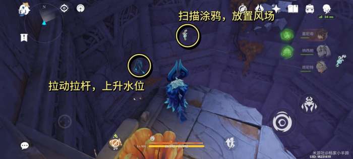 到达平台后,拉动下方拉杆使水位上升,期间扫描墙上涂鸦制造风场,到达顶端密室,获得珍贵宝箱*1
