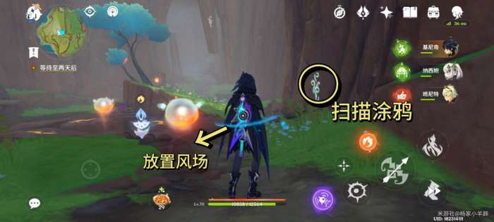 附身瞑视龙,扫描墙壁上的涂鸦,放置风场后,飞起捕捉顽皮幻写灵。