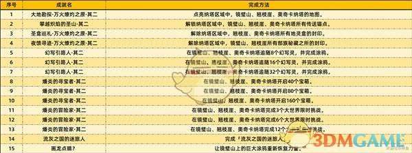 | 大地勘探·万火燎灼之原·其二 | 点亮纳塔区域中,镜璧山、翘枝崖、奥奇卡纳塔的地图。 | 5 |