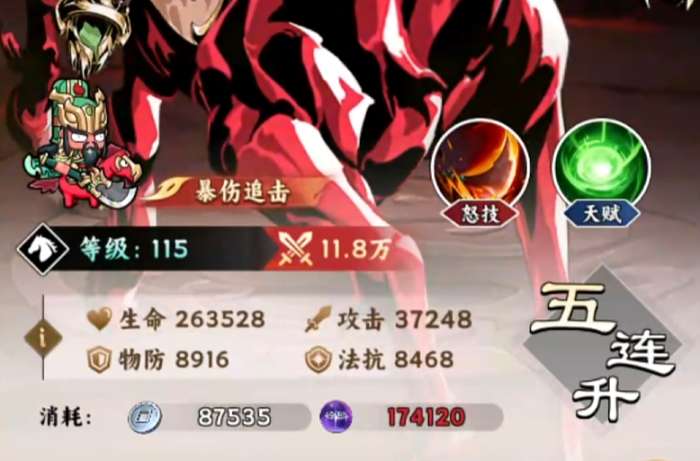 从技能描述和属性上来看,关羽的战斗力是非常之强的,在施展怒气技能之后,可以使面前的一整排敌方目标都受到伤害,当技能提升之后,还可以使自身的暴击率额外提升12%。同时还将会获得额外效果,也就是如果说目标的生命值低于25%,那么自身的暴击伤害能够再提升30%,这样的话基本上都是能够收割残血的。当关羽提升到五星的时候,暴击率还可以再提升15%,如果说在施展主动技能之后成功造成了暴击,那么还有一定的概率能够再造成一次额外的追击。