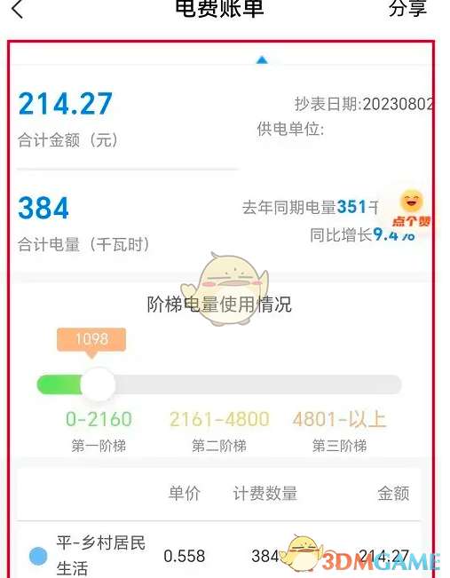 3、进去之后,可以看到电费账单明细,包括阶梯电量使用情况。