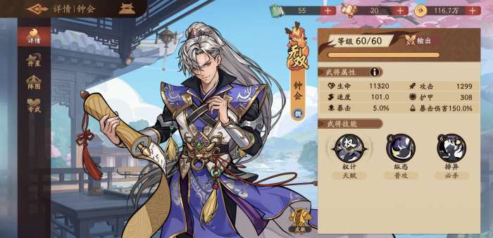 在游戏之前测试中,钟会是紫色武将,但是在目前版本中会成功升级到了无双品质,这一提升也展现出了策划对这个武将其实非常重视。在游戏开放之后的初始卡池中就可以直接有几率抽出来。