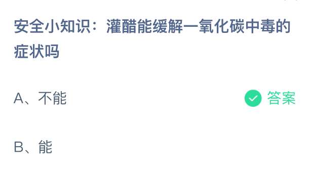 安全小知识:灌醋能缓解一氧化碳中毒的症状吗?支付宝小鸡课堂开课啦!每天花一分钟答题赚饲料,喂喂小鸡就能贡献爱心啦!轻松又意义十足!2026年1月4日蚂蚁庄园的小鸡课堂题目正确答案是【不能】,灌醋缓解一氧化碳中毒并没有科学依据,甚至可能刺激呼吸道加重病情。