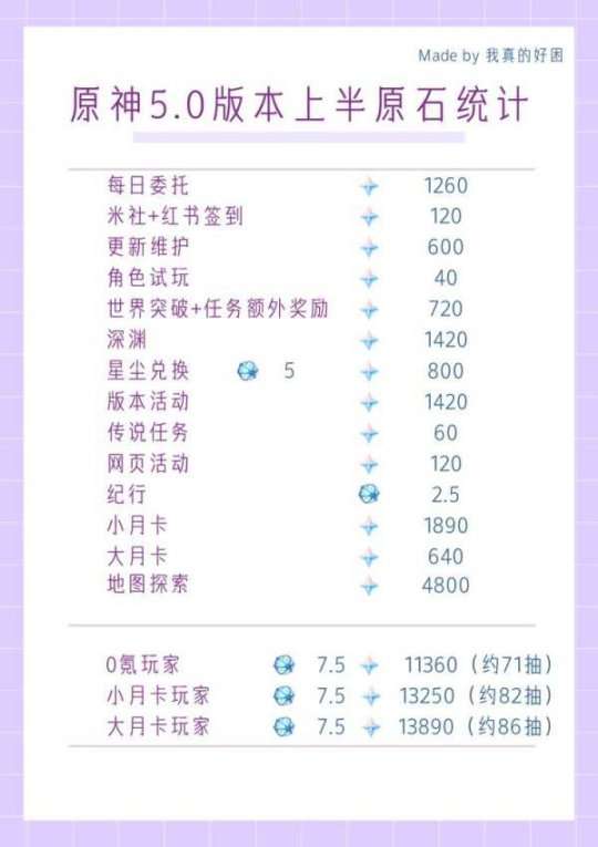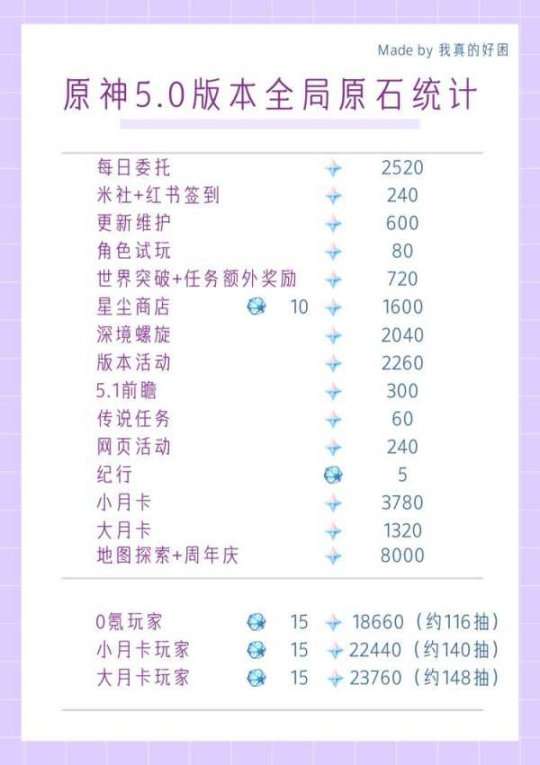 各位旅行者,原神5.0卡池即将开启,不知道想抽玛拉妮和万叶的玩家原石准备的怎么样了?这里我结合前瞻信息做出了5.0版本的原石统计,希望可以帮助大家做好抽卡规划。