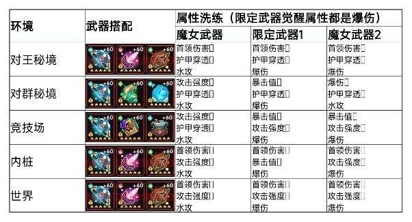 ps:除了腰带、魔角是固定属性(爆伤,爆伤+水攻)的,其余位置都可以根据环境改变属性