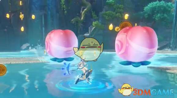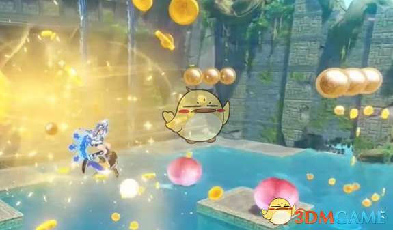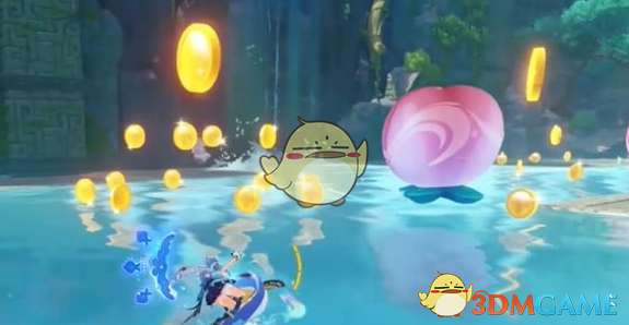 1、利用玛拉妮的元素战技在水面快速移动,躲避「巨大弹球」,拾取冒险币获得积分。