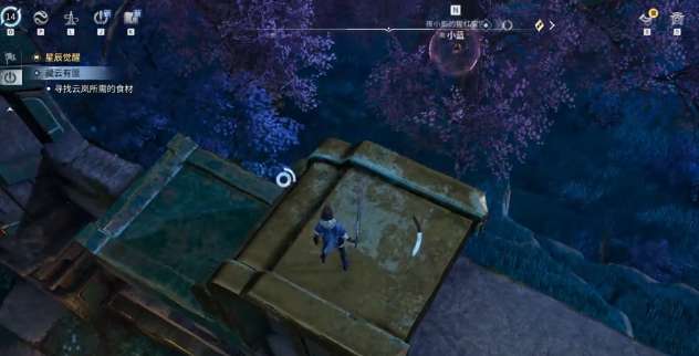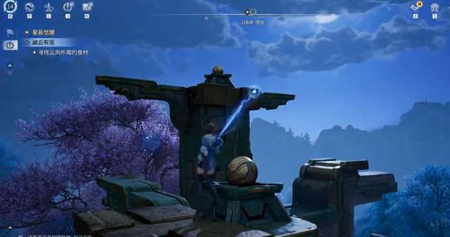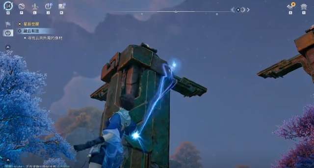 当我们跟随主线剧情推进到青野遗迹,清理完场地内的所有怪物后,可以看到场地的中间有几块石头,而其中有一个是亮着的。大家可能会比较好奇,为什么有一些视频里面的石头四个都是亮的,那是因为玩家早就已经完成了所有的任务。没有解谜的小伙伴们没有必要过于的纠结,玩家可以先站在初始的位置,看到地面上有一些碎片,没有必要去理会。视线转移到左侧,找到第一根可以交互的柱子,靠近之后点击交互键攀爬到柱子上。后找到上面的机关,开始旋转铁球。