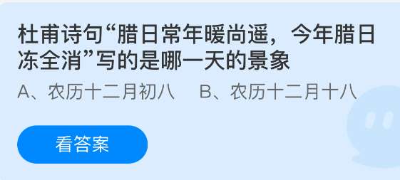 杜甫诗句“腊日常年暖尚遥,今年腊日冻全消”写的是哪一天的景象?支付宝小鸡课堂开课啦!每天花一分钟答题赚饲料,喂喂小鸡就能贡献爱心啦!轻松又意义十足!2026年1月31日蚂蚁庄园的小鸡课堂题目正确答案是【农历十二月初八】,诗句描绘的是腊八节(农历十二月初八)当天温暖如春、冰雪消融的特殊景象,反映了诗人对自然节候的敏感和对生活重归安定的寄托。