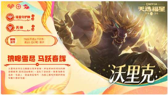 在2026福星守护神活动中,沃里克的解锁条件是:在7级或以上时,激活【6天神】羁绊。作为福星守护神/天神单位,其技能可提供高额攻速、生命偷取与移速,并在参与击杀后嚎叫,为自身及同羁绊友军带来群体攻速提升。