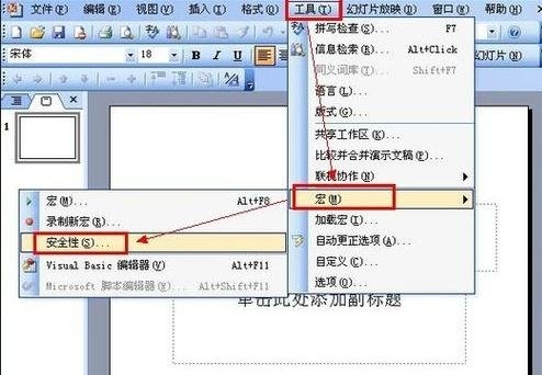 1、这个插件因为是用宏编写的,所以在使用前,先要在PPT中设置:依次点选菜单“工具-->宏--> 安全性”项;