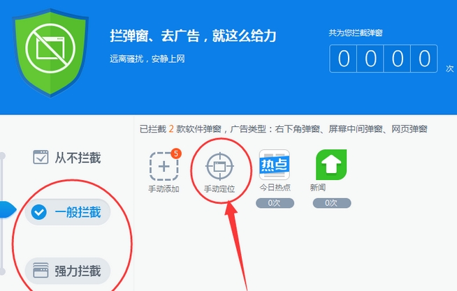 3、在“弹窗拦截”中选择“一般拦截”或是“强力拦截”,选择好后点击“手动定位”;
