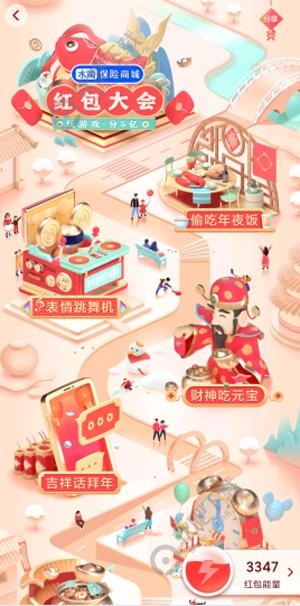 在红包大会活动中体验偷吃年夜饭、表情跳舞机、财神吃元宝、吉祥话拜年、变小孩拿红包、嘟嘟聚宝盆、舞狮吃彩球、姿势大作战、喜从天降、红包入袋、点头娃娃机、好运挂一挂、亲戚走起来、幸运饺子、成语猜猜乐、AR找红包等活动,并分享游戏视频。