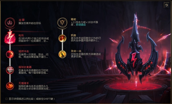 1.电刑:三秒内用三个独立的攻击或技能命中地方,会造成额外的自适应伤害。电刑在前期可以说是伤害最高的符文,对于前期时优势最为突出的卡特琳娜来说非常适合。