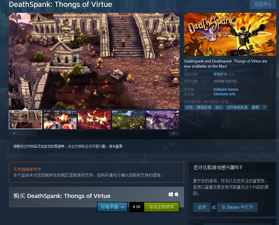 随着《星球大战绝地:陨落的武士团》登录Steam平台,并且获得了许多玩家的好评。这次的名利双收,让EA选择将更多之前发布的游戏登陆steam平台。近日有玩家发现《戴斯班克:雪山地牢(DeathSpank: Thongs of Virtue)》已登陆steam国区售卖,售价50元,不支持中文。感兴趣的和PK手游网东东一起来看看这款游戏吧!