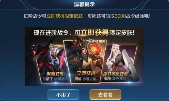 S17赛季的荣耀战令两款皮肤是周瑜的赤莲之焰和兰陵王的驯魔猎人,如果有能力的,而且经常玩的话,这个建议还是得进阶一下,会多很多奖励。