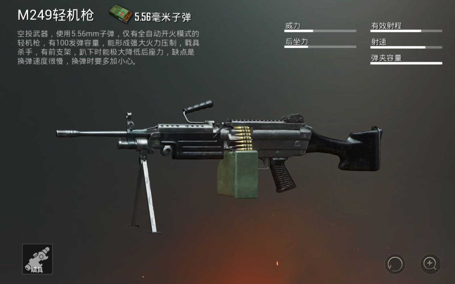 作为尊贵的空投武器之一的M249,使用5.56mm子弹,弹匣容量高达100发,仅支持全自动射击模式,除了能装备主瞄具和侧面准镜外,不可以装备其他配件。M249空仓换弹需要消耗大概8.1秒左右,战术换弹需要消耗大概7秒左右。轻机枪换弹时间长这一缺点,M249简直表现得淋漓尽致。