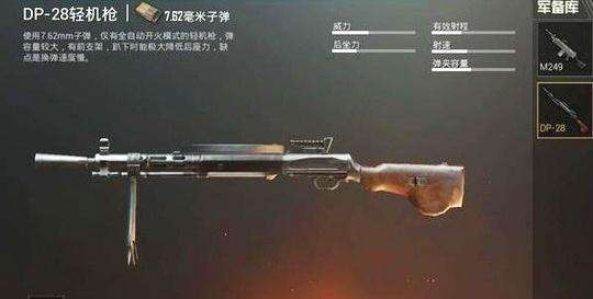 而DP-28由于弹匣外形特殊,人称“大盘鸡”!DP-28是目前游戏中唯一一把非空投武器的轻机枪,采用7.62mm子弹,弹匣容量47发,只有全自动射击模式,仅能装备主瞄具,没有其它的配件槽。相较于M249,DP-28的空仓换弹和战术换弹时间均要短一些,分别是大概5.4秒左右和4.4秒左右。